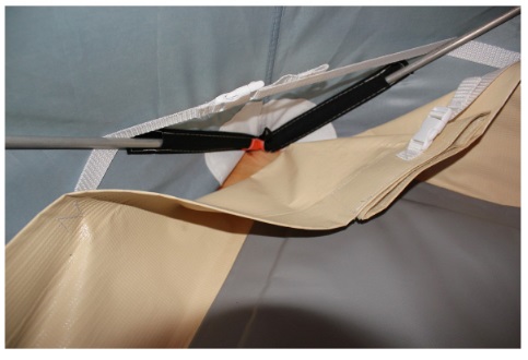 Уникальная система крепления, разработанная компанией Митек, позволяет надежно зафиксировать пол к каркасу палатки при помощи стропы с фастексом. Имеет дополнительные 4 оттяжки для крепления на льду.Характеристики